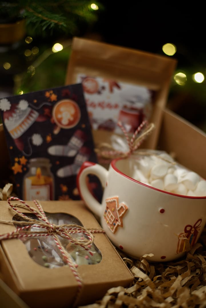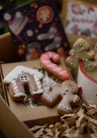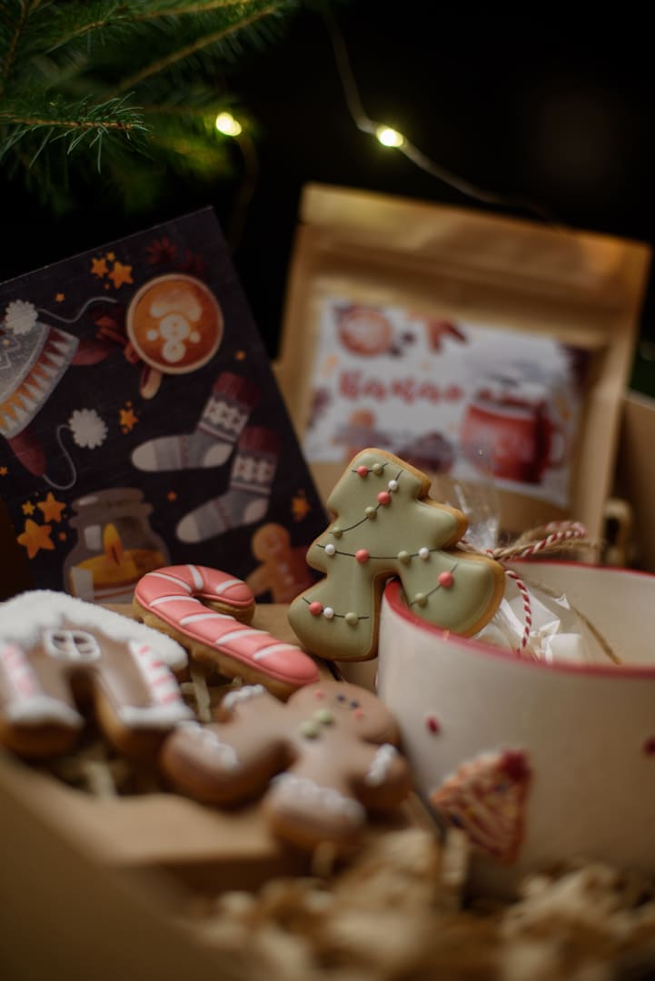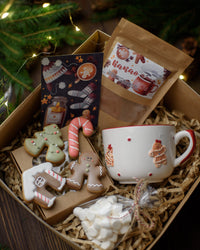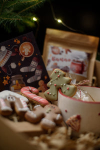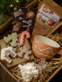 The set includes: a hygge scented soy candle, a set of 4 delicious hygge gingerbreads and fruit tea.